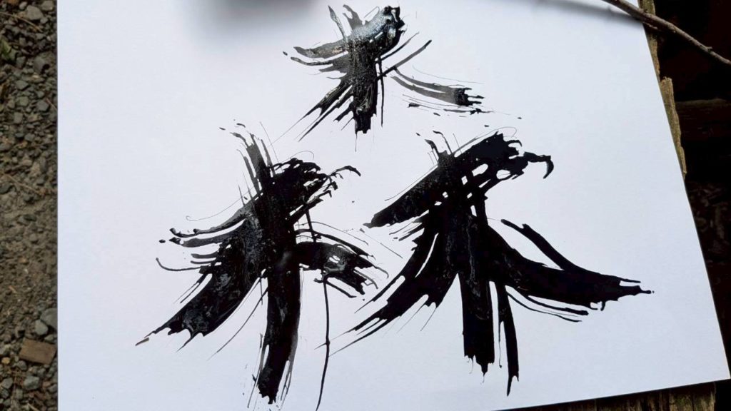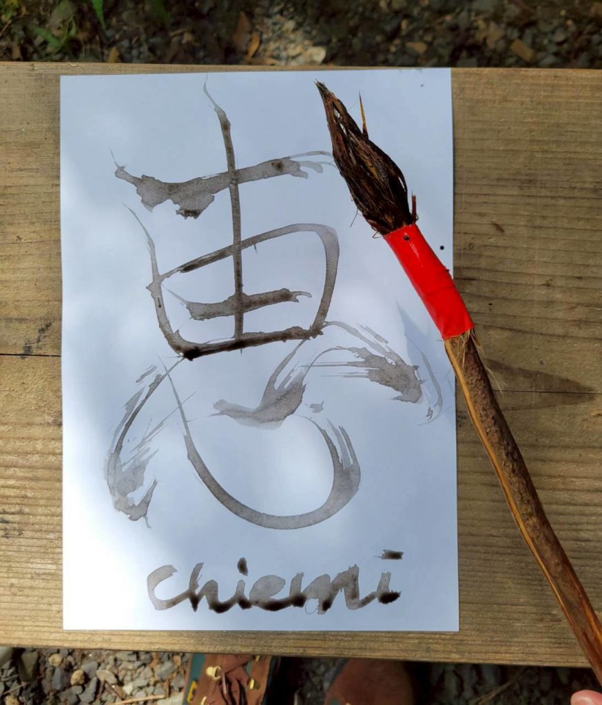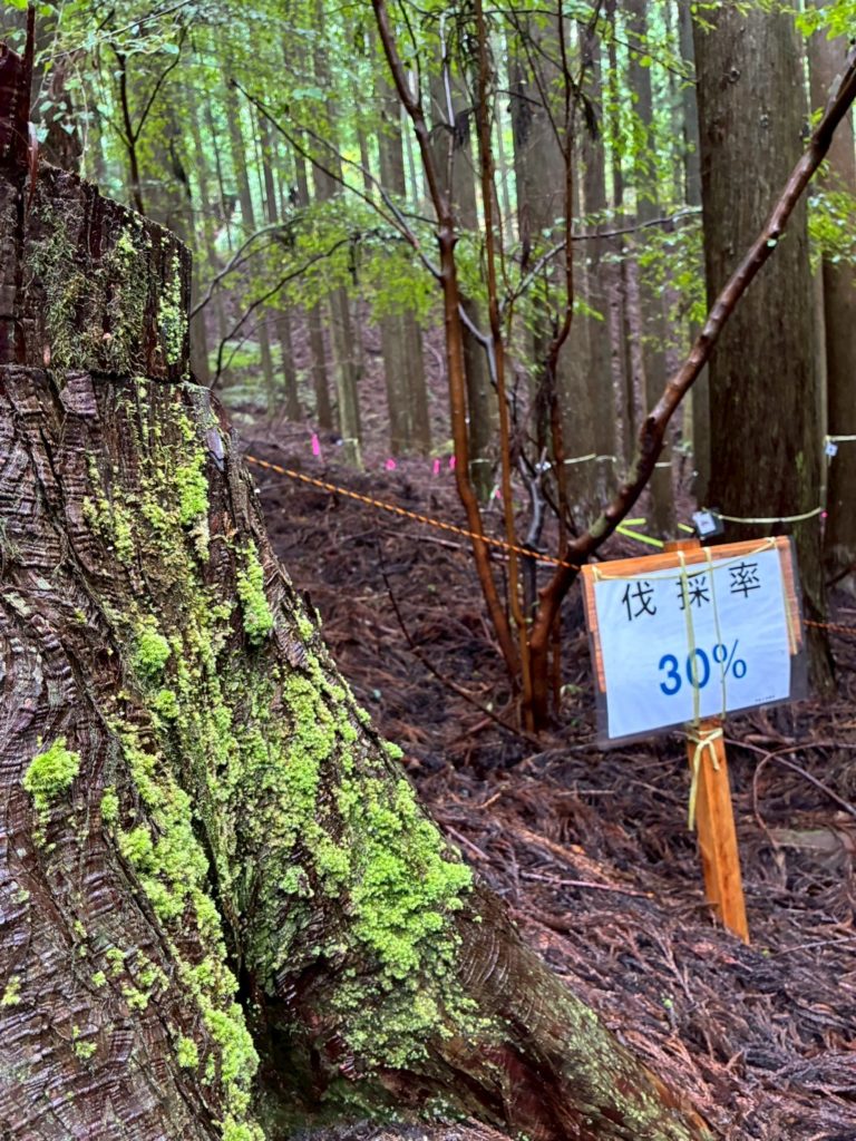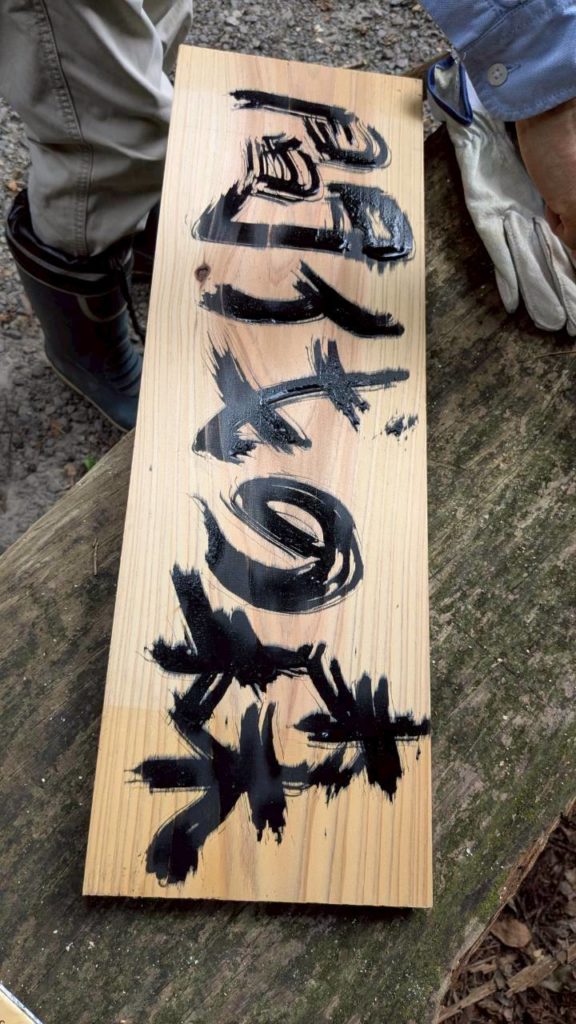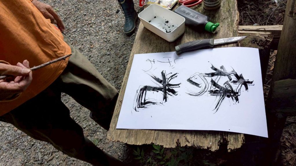 活動の内容は、①ヒノキを2本伐倒、②木の皮をはぐ、③竹、杉の葉で作った筆で試し書き、④植物の観察とデータ取りを行った。