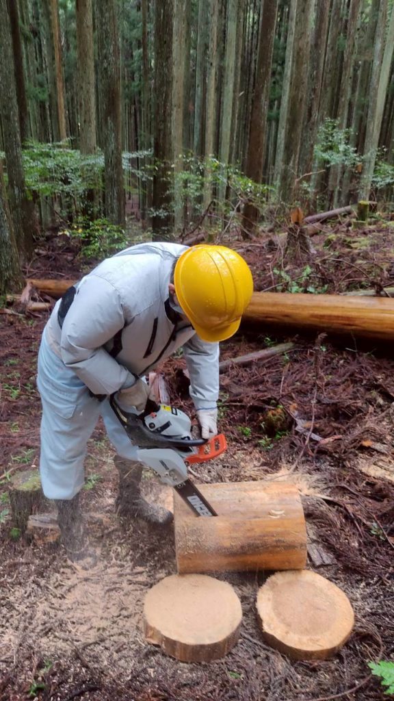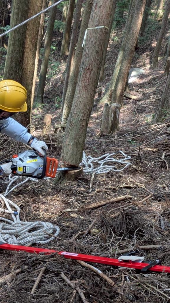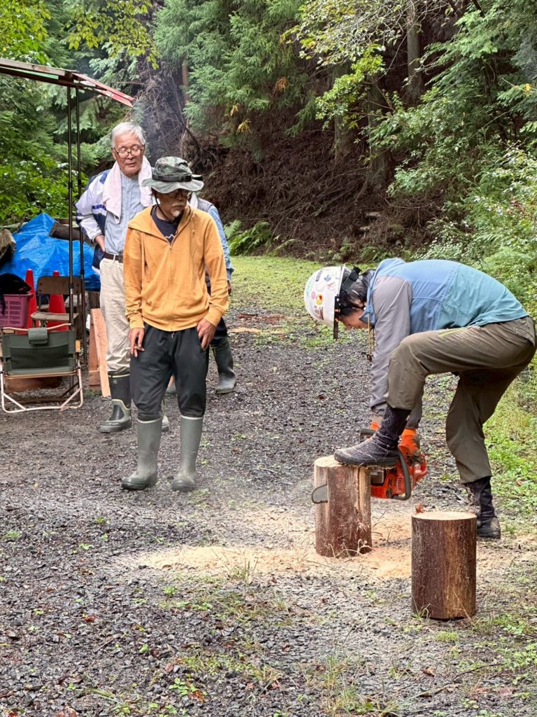 ②丸太を盾に真っ二つにする練習(猪塚)、初の縦引きは見事でした。