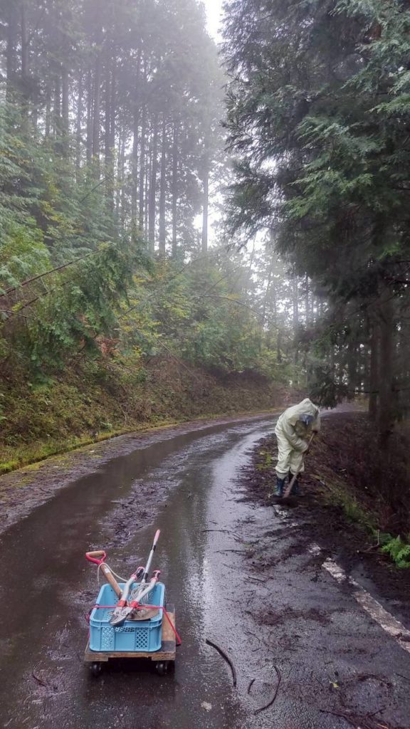9月28日(日)の活動は、①環境イベントについての話し合いと確認、②生物共生サイト植物の状況観察と確認、③栗の木伐倒、④山道の倒木の片付けと車道の枝払いでした。